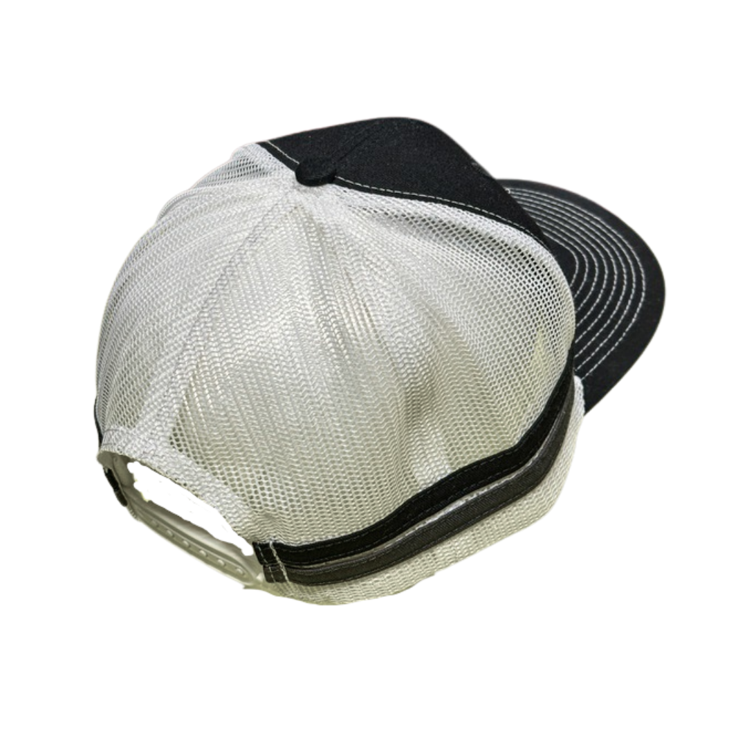 An adjustable, vintage style truck hat with racing stripes on the back! Black front, 6-panel design with white mesh on the back.